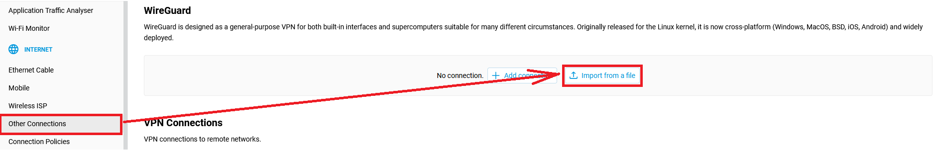 4. Open the router interface again and select the "Other connections" menu. Click the "Import from a file" button and select the file obtained from the AmneziaWG Configurator.