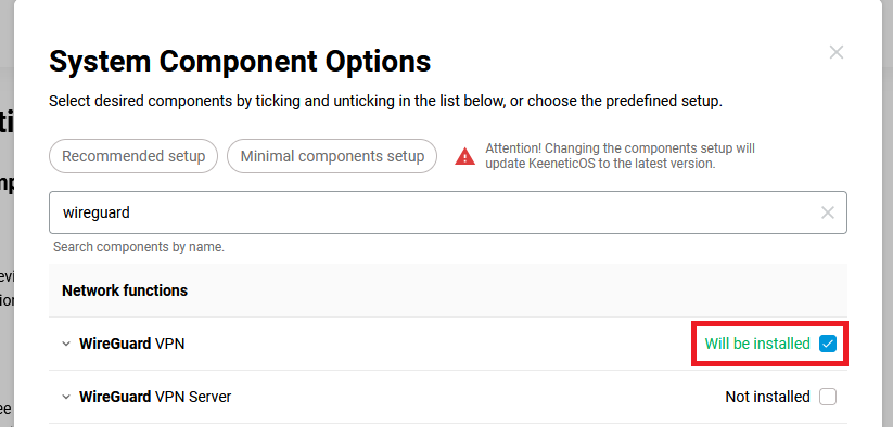 2. Enter "wireguard" in the search field, then check "WireGuard VPN" and click the "Update KeeneticOS" button.
