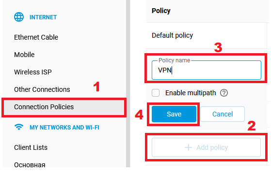 1. Open the "Connection Policies" menu and create an Internet access policy (in our example, the policy is named "VPN"):
